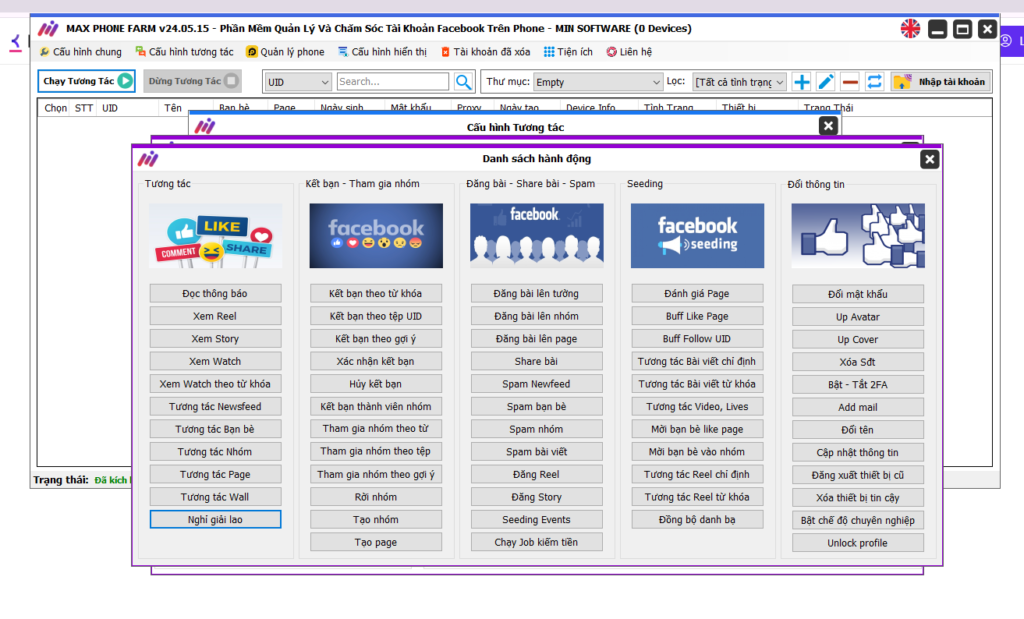 Phần mềm nuôi nick tương tác Facebook trên điện thoại thật MaxPhoneFarm là giải pháp hoàn thiện cho việc PhoneFarm Facebook thuận lợi hơn.